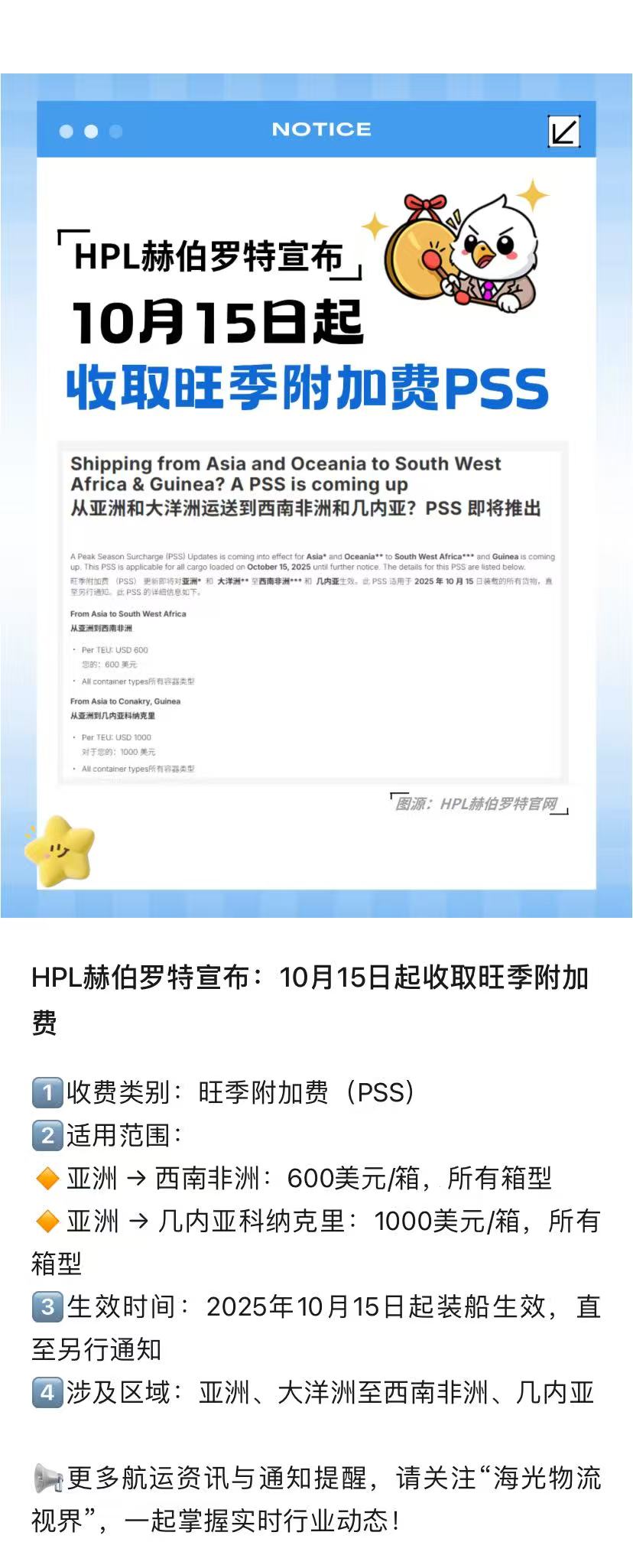 HPL赫伯罗特宣布:10月15日起收取旺季附加费